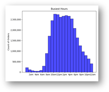 The busiest hours per day with the most orders are between 9 a.m. and 5 p.m., with the highest peak between 10 a.m. and 12 p.m.