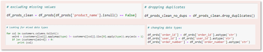 Consistency checks were performed on each data set, such as excluding certain missing values, dropping duplicates, looking for mixed data types, and adjusting data types.