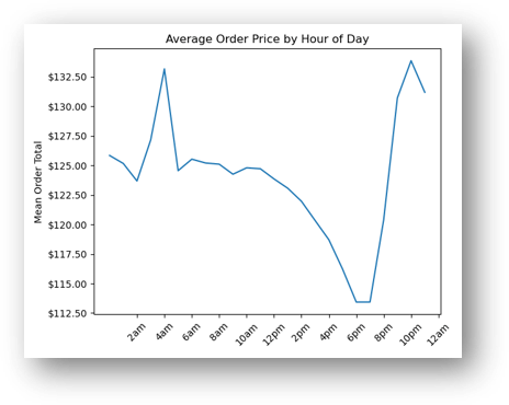 People spend the most money per order averaged between 9 p.m. and 8 a.m. This is the opposite from order volume. There is a large dip in the amount of money people spend from about 2 to 8 p.m. With the biggest dip from 6 to 7 p.m.