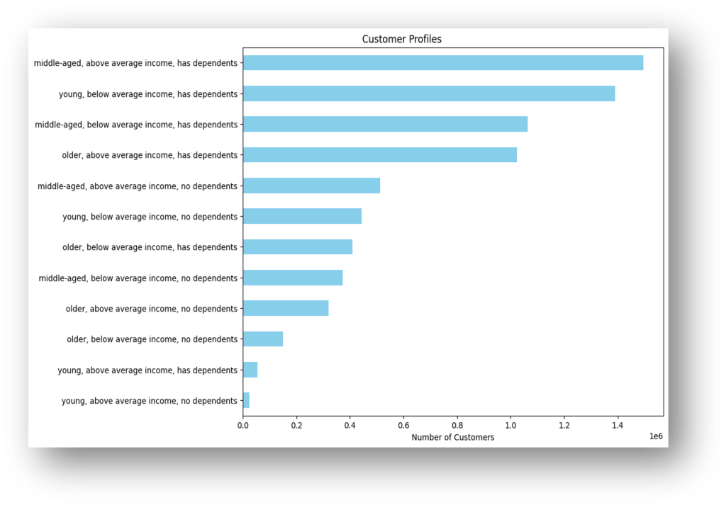 We can see that the largest customer demographic is “middle-aged, above-average income, has dependents.” And we can see that “young, above-average income,” regardless of dependents is our smallest demographic.