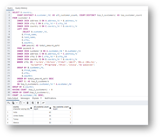 To determine how many of our top 5 customers were based within each country, joins and subqueries were used.